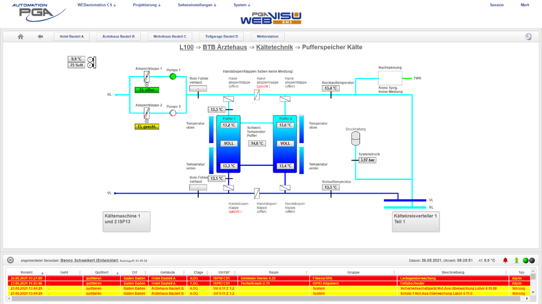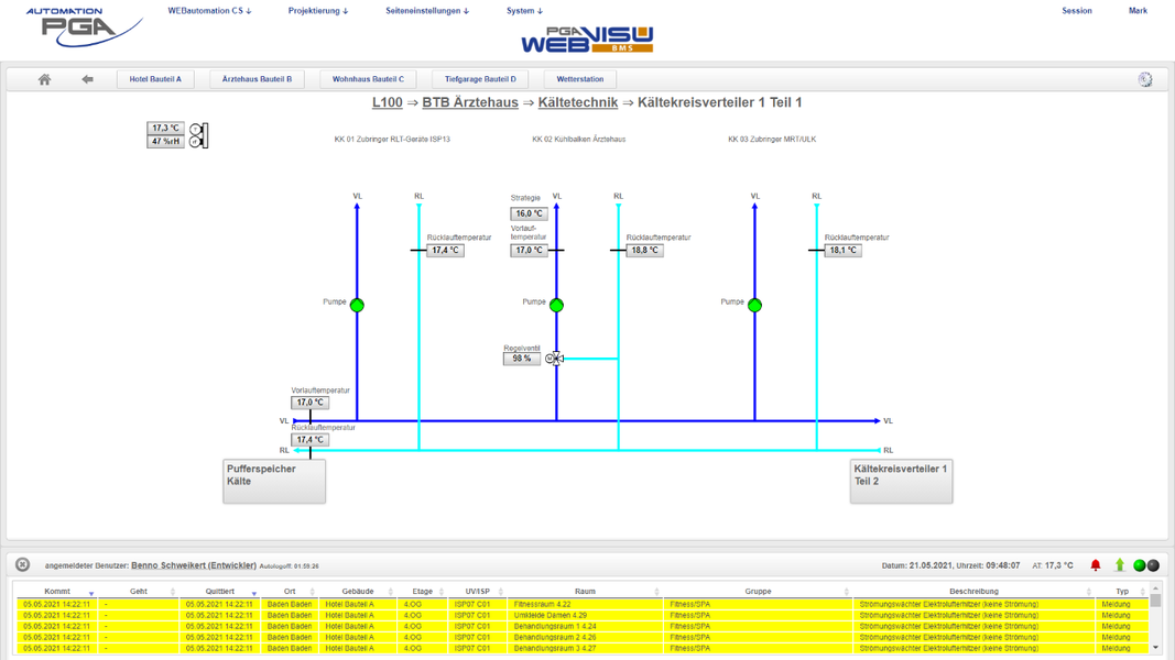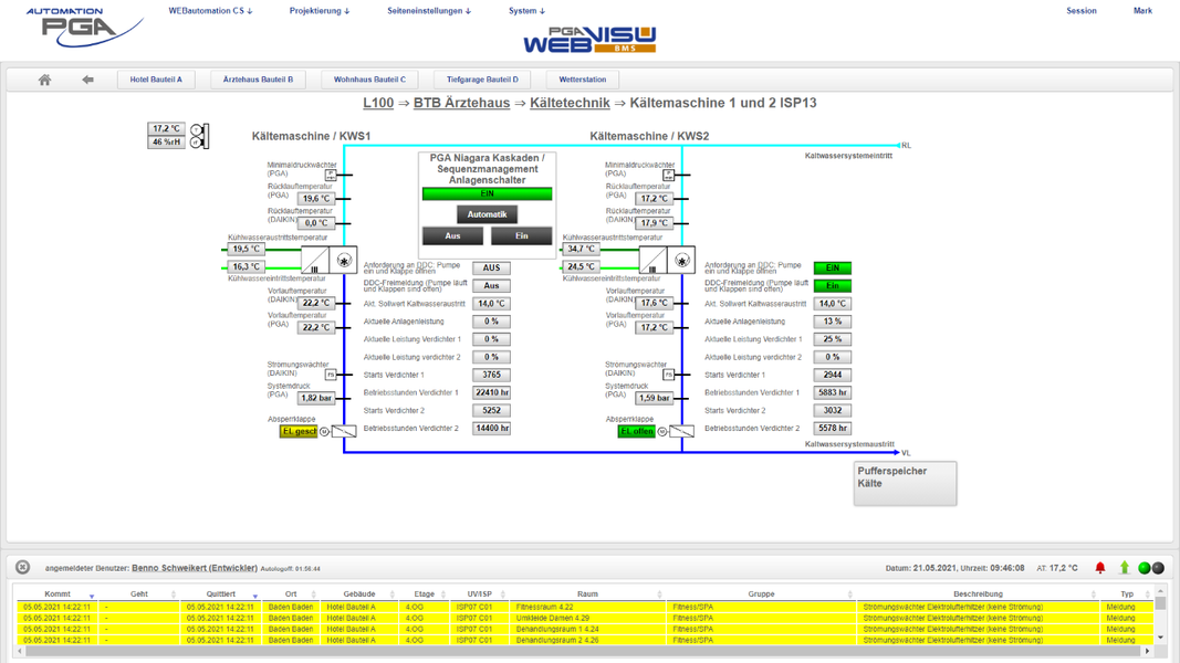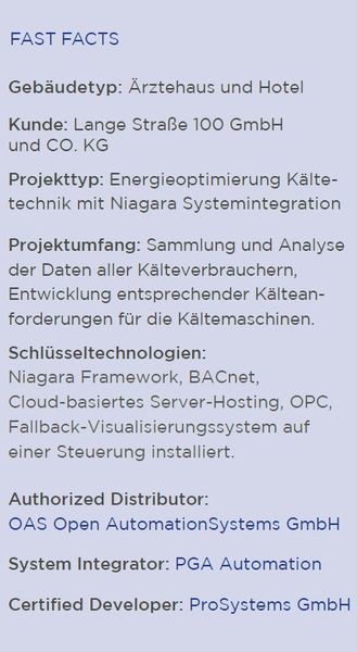 Das gesamte Quartier wurde vor fünf Jahren mit rund 40.000 Datenpunkten über alle Anwendungen der Gebäudetechnik durchgängig digitalisiert. Die Digitalisierung, begonnen von der Automation der Primäranlagen, Heizung, Kälte- und Raumlufttechnik, Sanitär über die durchgängige Raumautomation mit Beleuchtung, Sonnenschutz bis zur Integration des Hotelbuchungssystems OPERA-Fidelio von ORACLE und der webbasierten PGA WEBvisuBMS, erfolgte herstellerunabhängig.